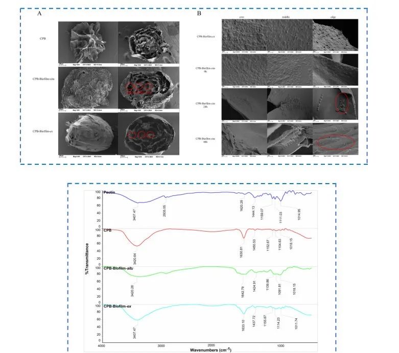 Figure 5: Scanning electron microscopy (SEM) of calcium pectin beads: (A) Surface morphology of calcium pectin beads; (B) Distribution of strains in CPB-Biofilm-situ and CPB-Biofilm-ex.