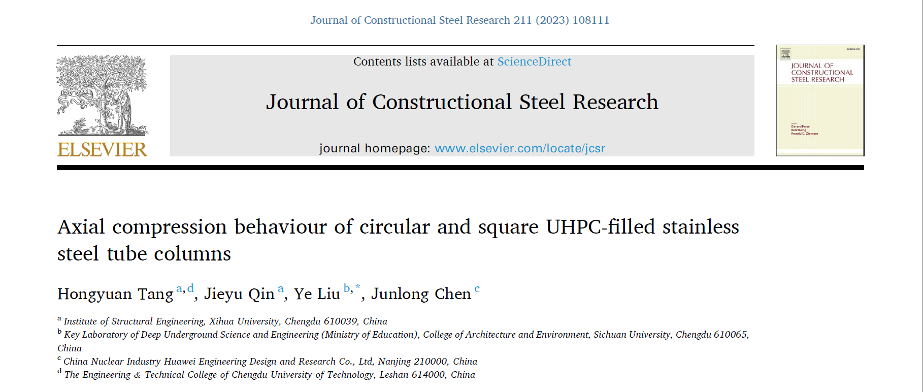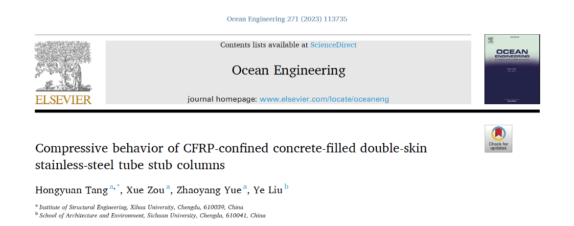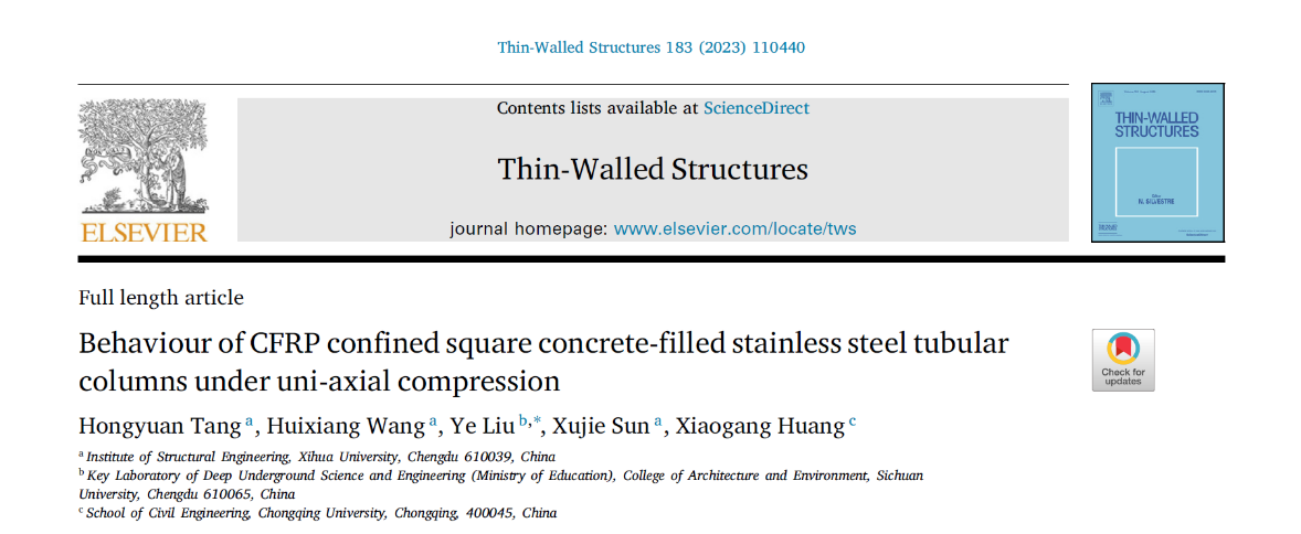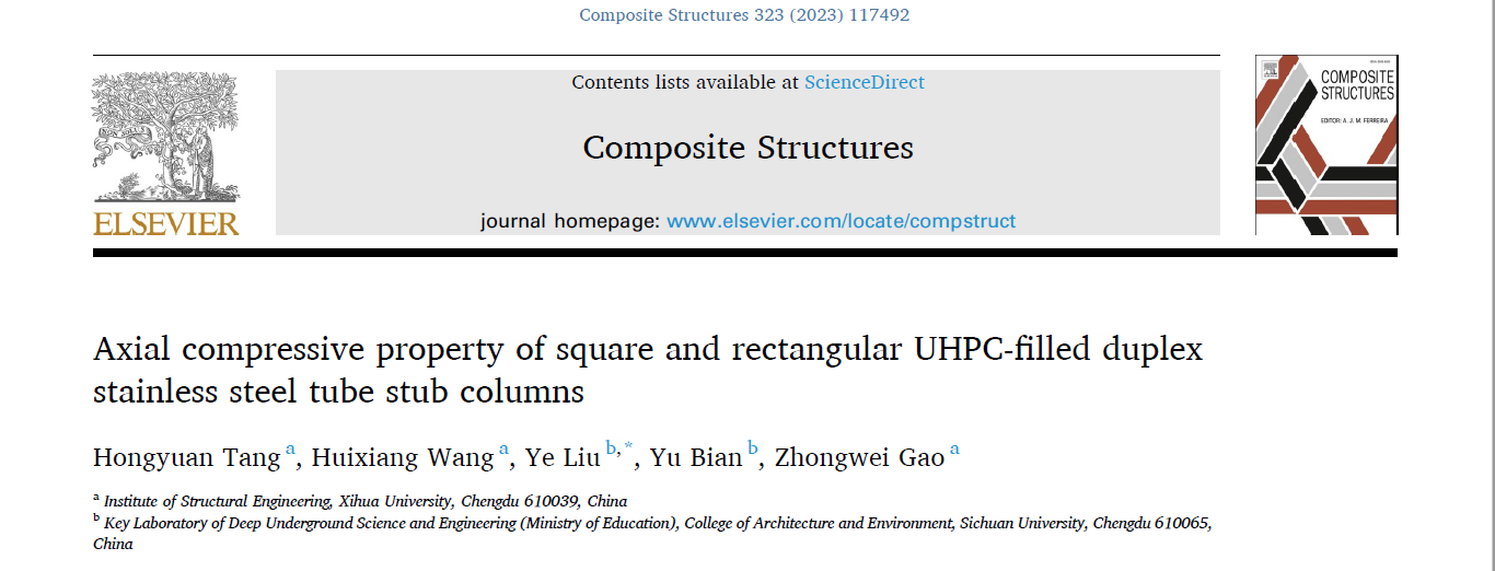 近期,建筑与土木工程学院“创新工程结构研究中心”团队唐红元教授在不锈钢管超高性能混凝土柱研究方向取得重要成果,其中多项成果在国际土木工程学科TOP期刊Composite Structures(中科院一区,IF=6.3)、Thin-Walled Structures(中科院二区,IF=6.4)、Ocean Engineering (中科院二区,IF=5.0)、Journal of Constructional Steel Research (中科院二区,IF=4.1)发表。西华大学唐红元教授为第一作者,所指导的2020级硕士研究生王辉祥(推荐到北京工业大学攻读博士学位,导师为中国工程院欧进萍院士),2021级硕士研究生邹雪和秦洁钰为成果做了大量科研工作。