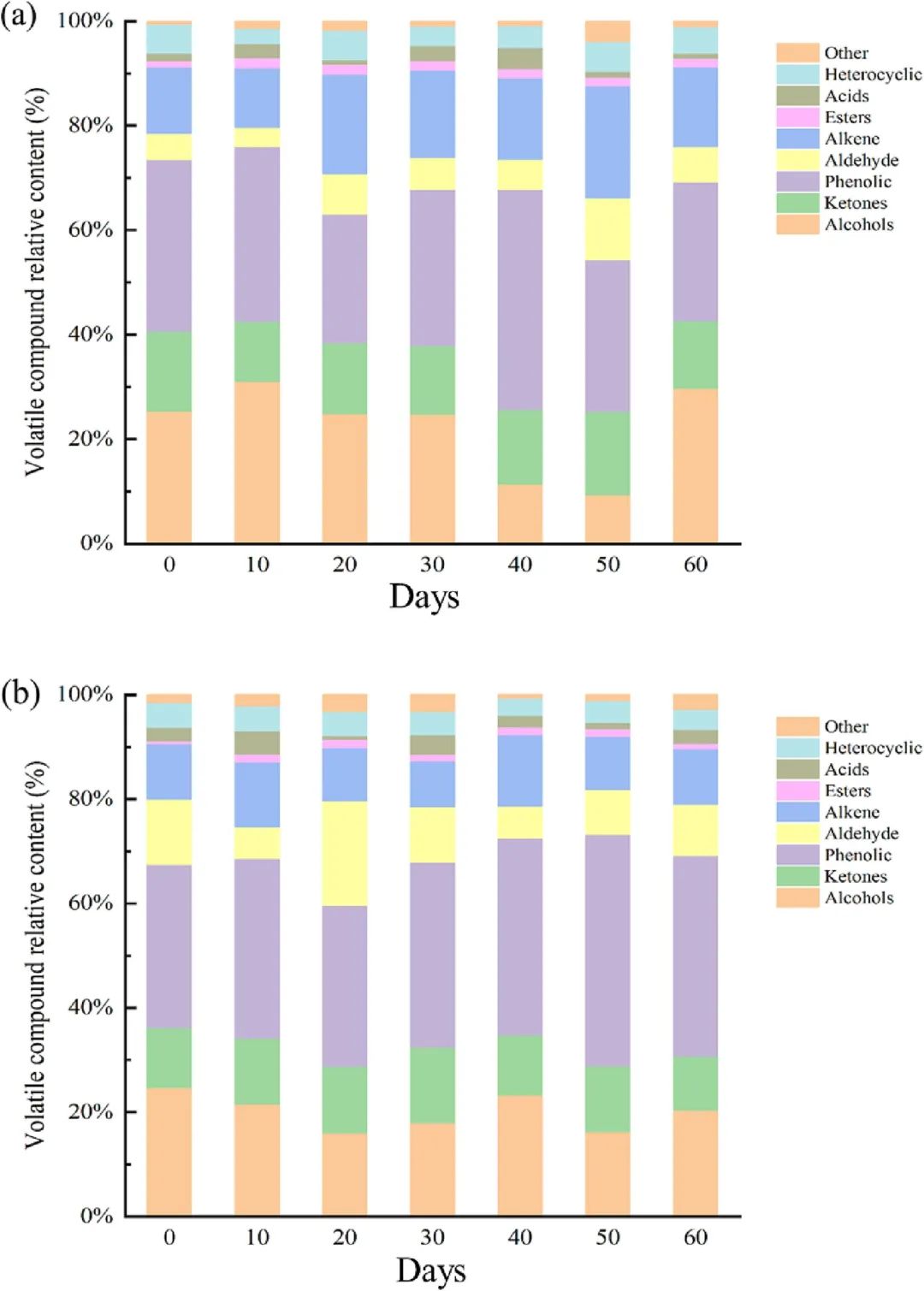 图3 两种熏肉贮存过程中挥发性风味物质相对含量的变化(a)对照组,(b)替代盐组
