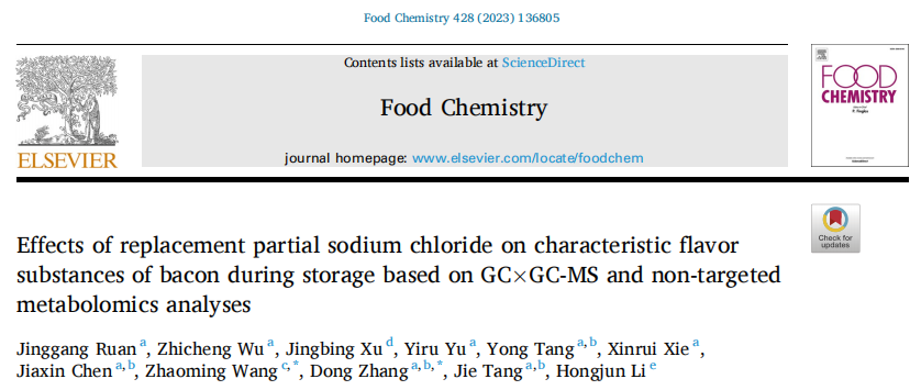 西华大学食品与生物工程学的阮景刚等在Food Chemistry期刊上发表了《Effects of replacement partial sodium chloride on characteristic flavor substances of bacon during storage based on GC×GC-MS and non-targeted metabolomics analyses》文章(通讯作者:Wang Zhaoming和Zhang Dong)。