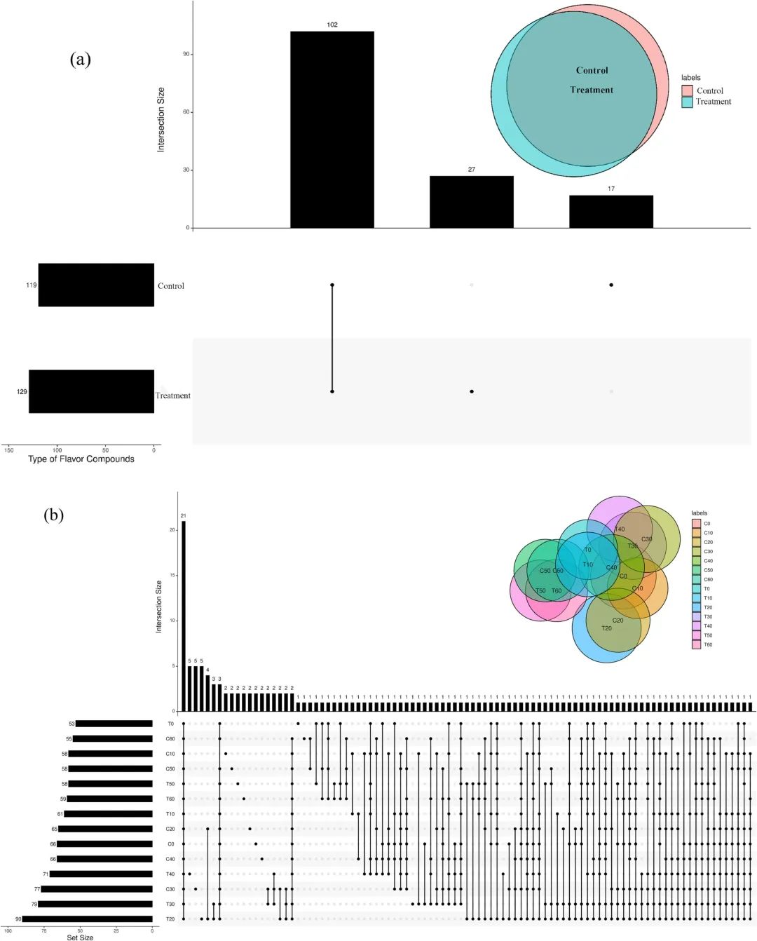 图2 两种熏肉(a)和两种熏肉在不同贮存时间下(b)挥发性风味物质的维恩图