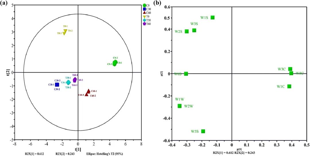 图5 两种熏肉电子鼻分析结果的PCA图 (a)得分图,(b)载荷图