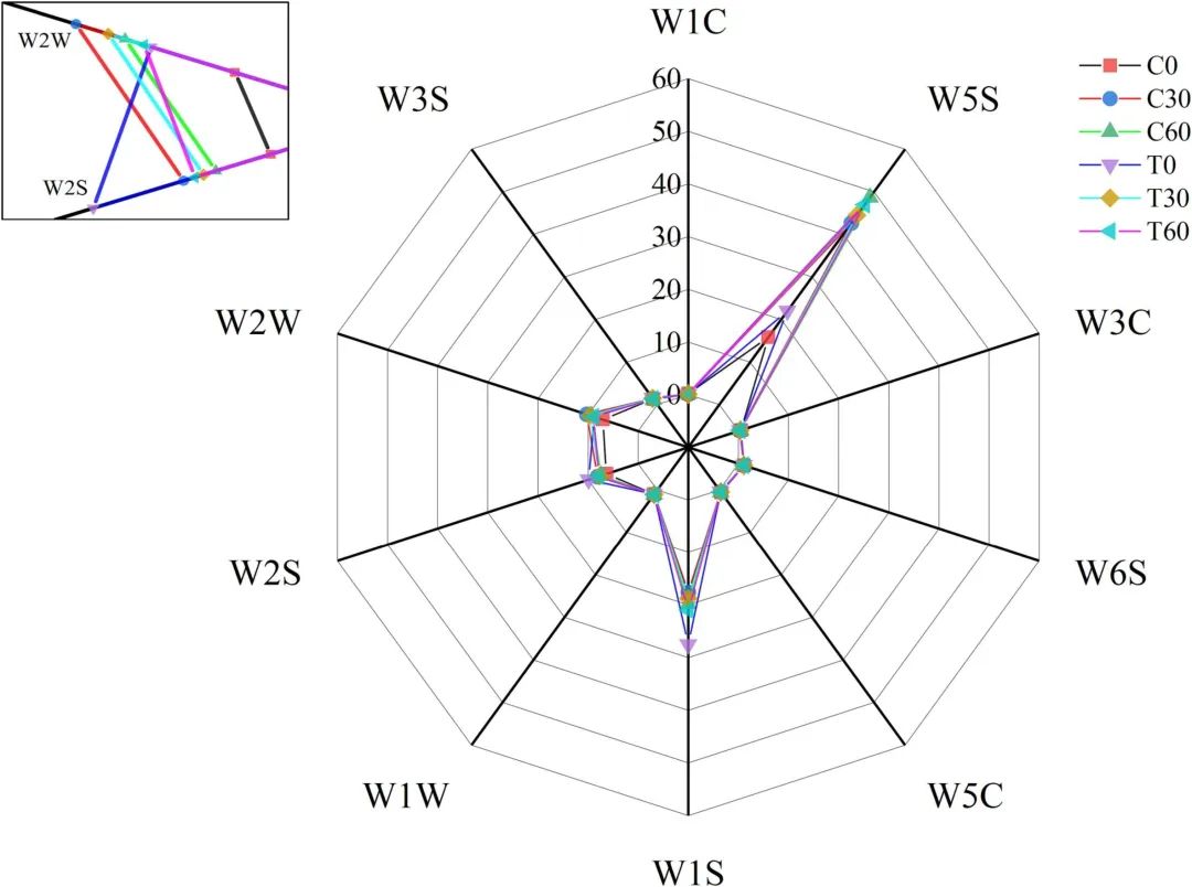 图6 两种熏肉贮存期间的电子鼻雷达图