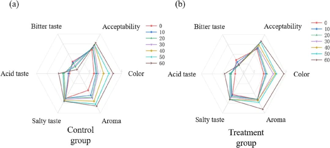 图1 熏肉储存期间感官评分的变化 (a)对照组,(b)替代盐组