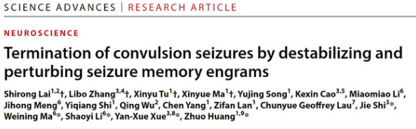 近日,大健康管理学院青年教师赖世荣博士(第一作者)与北京大学药学院黄卓教授团队的合作论文《Termination of convulsion seizures by destabilizing and perturbing seizure memory engrams》在Science Advances杂志(IF=14.57)发表。