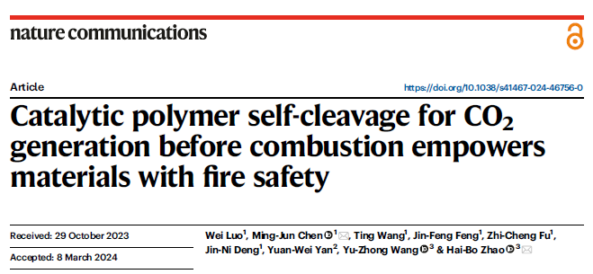 近日,理学院功能高分子材料绿色制备与循环利用研究团队2021级硕士研究生罗伟,以第一作者身份在Nature Communications(IF=16.6)上发表题为“Catalytic polymer self-cleavage for CO2 generation before combustion empowers materials with fire safety”的研究论文。理学院陈明军教授和四川大学赵海波教授为共同通讯作者,该工作得到了四川大学王玉忠院士和中车集团株洲时代新材料科技股份有限公司正高级工程师颜渊巍博士等人的指导与帮助。该研究得到了国家自然科学基金项目(21975208、U22A20150和22205184)和四川省科技计划项目(2023ZYD0030和2020JDJQ0062)的资助。