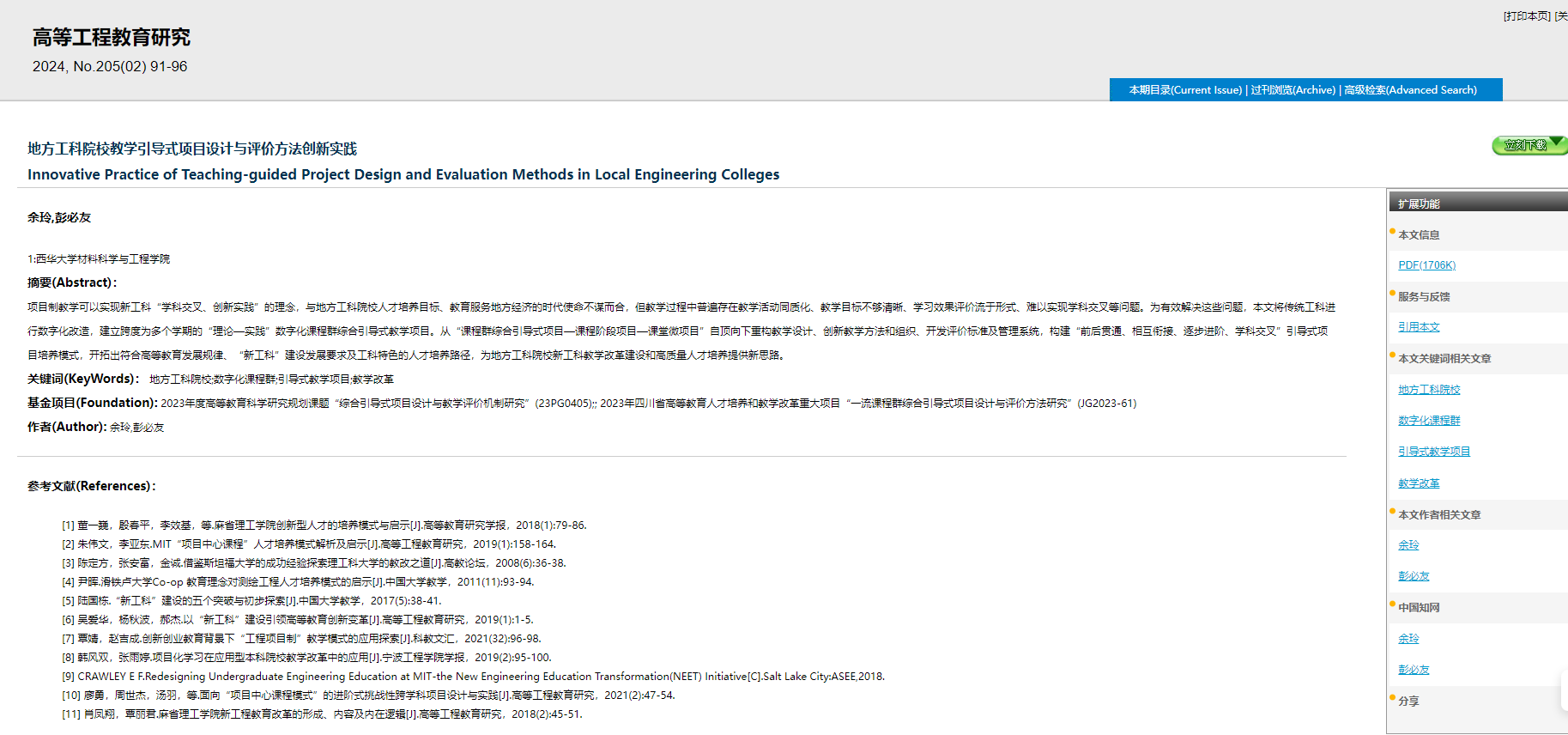 近日,材料科学与工程学院彭必友教学科研团队在CSSCI来源期刊《高等工程教育研究》发表名为“地方工科院校教学引导式项目设计与评价方法创新实践”的教研论文,论文第一作者为材料学院余玲高级实验师。该项研究工作得到2023年度高等教育科学研究规划课题“综合引导式项目设计与教学评价机制研究”(23PG0405)、2023年四川省高等教育人才培养和教学改革重大项目“一流课程群综合引导式项目设计与评价方法研究”、2023年西华大学教育教学改革重点项目“综合引导式项目教学培养创新型人才的研究与实践”(xjjg2023003)的支持。