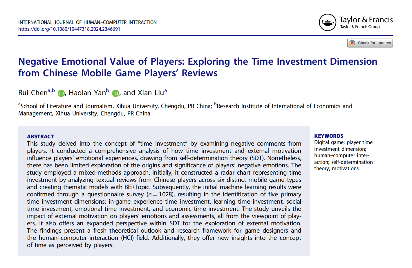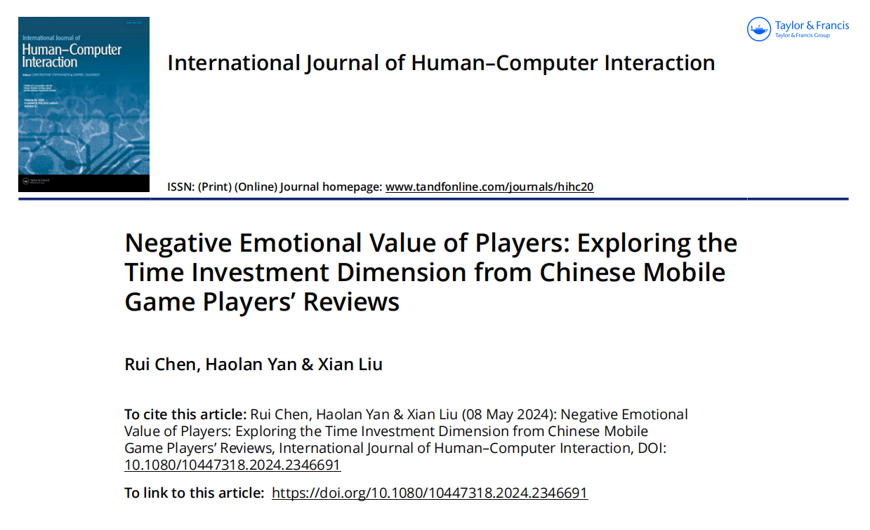 近日,文学与新闻传播学院、国际经济与管理研究院陈睿副教授研究团队,在计算机科学与人机交互领域国际期刊《International Journal of Human–Computer Interaction》(SSCI JCR 1区)发表题为“Negative Emotional Value of Players: Exploring the Time Investment Dimension from Chinese Mobile Game Players’Reviews”的文化研究论文;陈睿副教授为论文的第一作者,国际经济与管理研究院2022级工商管理专业硕士研究生严浩澜、文学与新闻传播学院2021级文艺学专业硕士研究生刘显为论文共同作者。西华大学为论文的第一完成单位和通讯单位。该研究工作为国家自然科学基金面上项目(72374171)的阶段性成果之一。