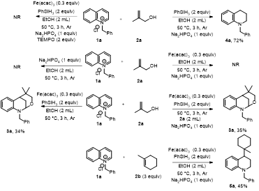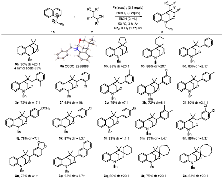 作者以N-苄基喹啉季铵盐1a和2-甲基烯丙醇2a作为模板底物,对催化剂、还原剂、溶剂、温度、时间和添加剂等进行筛选,得到最优条件:在氩气氛围下,以乙醇为溶剂,乙酰丙酮铁为催化剂,苯硅烷为还原剂,磷酸氢二钠为添加剂,50度油浴下反应3小时,最高91%的收率得到目标产物。作者通过1H NMR,13C NMR,HR-MS、XRD对化合物3a进行了结构鉴定。