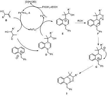 含氮/含氧杂环化合物在自然界中广泛存在,特别是含有八元环的桥环化合物具有吸引力,因为这些具有类似切割形状官能团的分子最近已成为分子识中的有用工具。在该家族成员中,苯并噁唑嗪类化合物因其重要的药物性质而受到广泛关注,例如镇痛、抗血栓、抗癌和抗氧化活性。尽管苯并[d][1,3]噁唑嗪类化合物包含存在于天然产物和药物分子中的四氢喹啉和N,O-缩醛部分,但对其研究较少。去芳构化反应是一种有效的从简单化合物合成复杂分子的有效手段,比如合成三维结构的碳环分子。Taheri小组和Mondal小组开发了N-喹啉盐与酚类化合物的去芳构化反应,合成了苯并[d][1,3]噁唑嗪类化合物。然而未见自由基策略合成苯并[d][1,3]噁唑嗪的研究。因此我们发展了N-烷基喹啉季铵盐的还原自由基去芳构化反应,构建了结构复杂的苯并[d][1,3]噁唑嗪。