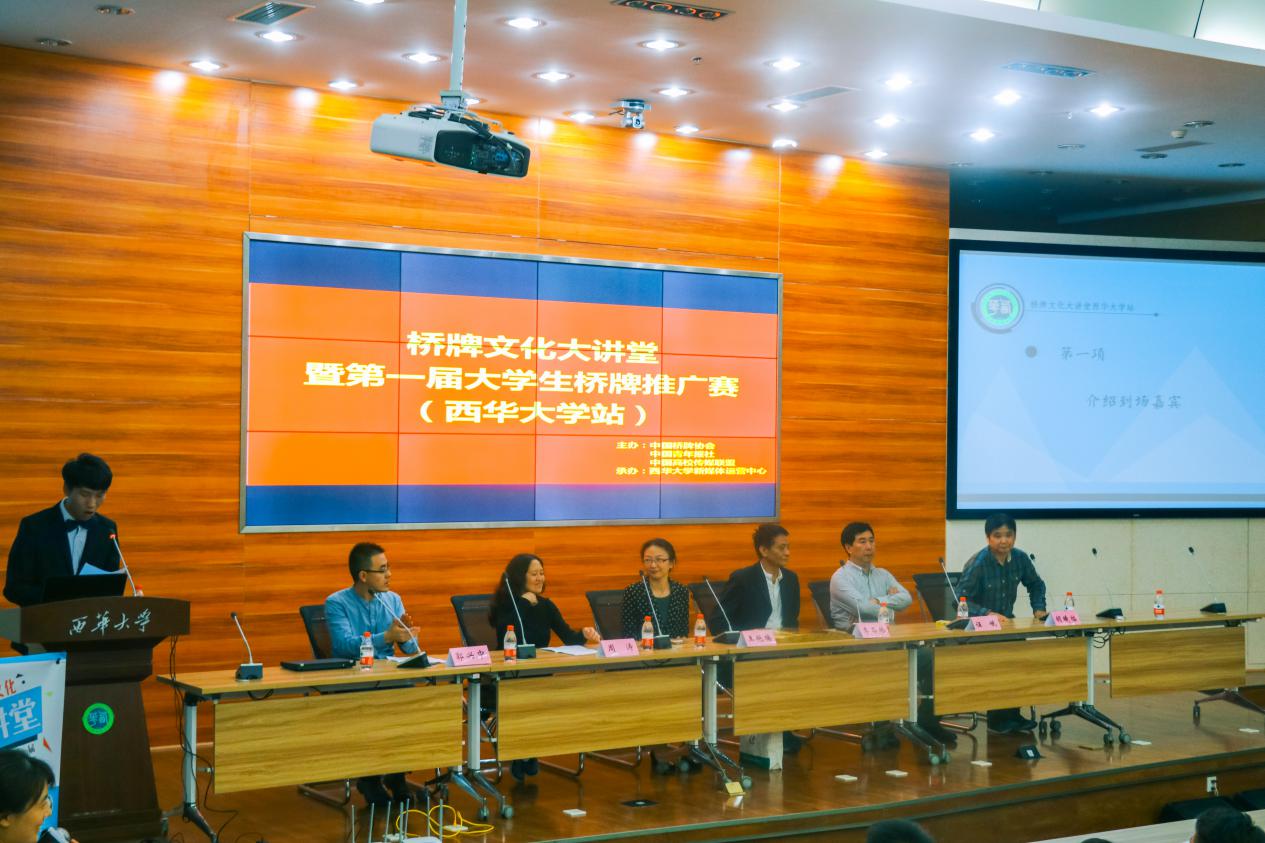 10月19日晚7点,由中国桥牌协会、中国青年报社、中国高校传媒联盟共同主办的桥牌文化大讲堂在我校图书馆报告厅拉开帷幕,200多名爱好桥牌的在校学子参与了此次活动。世界桥牌锦标赛冠军周涛,中国桥牌终身大师、天津桥牌协会秘书长伍岷,中国桥牌协会副秘书长王艳楠、《中国体育报》副总编陈君,四川省桥牌协会副秘书长李石林等众多桥牌界权威人士莅临我校并出席活动现场。