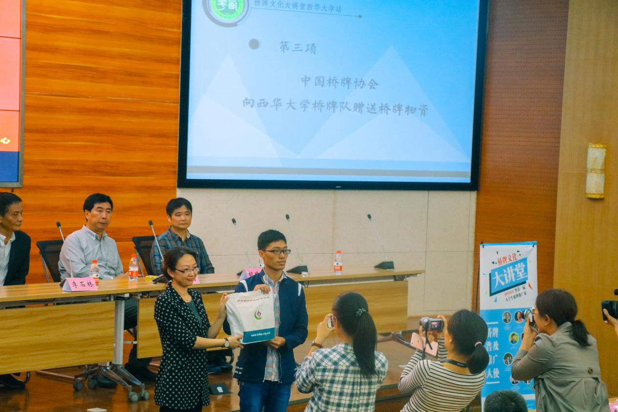 活动期间,四川省桥牌协会副秘书长李石林代表四川桥协授予我校“四川省青少年桥牌训练基地”,国家体育总局棋牌运动管理中心桥牌部副主任、中国桥牌协会副秘书长王艳楠向学校赠送了桥牌物资,我校胡曦临老师代表学校接受物资。