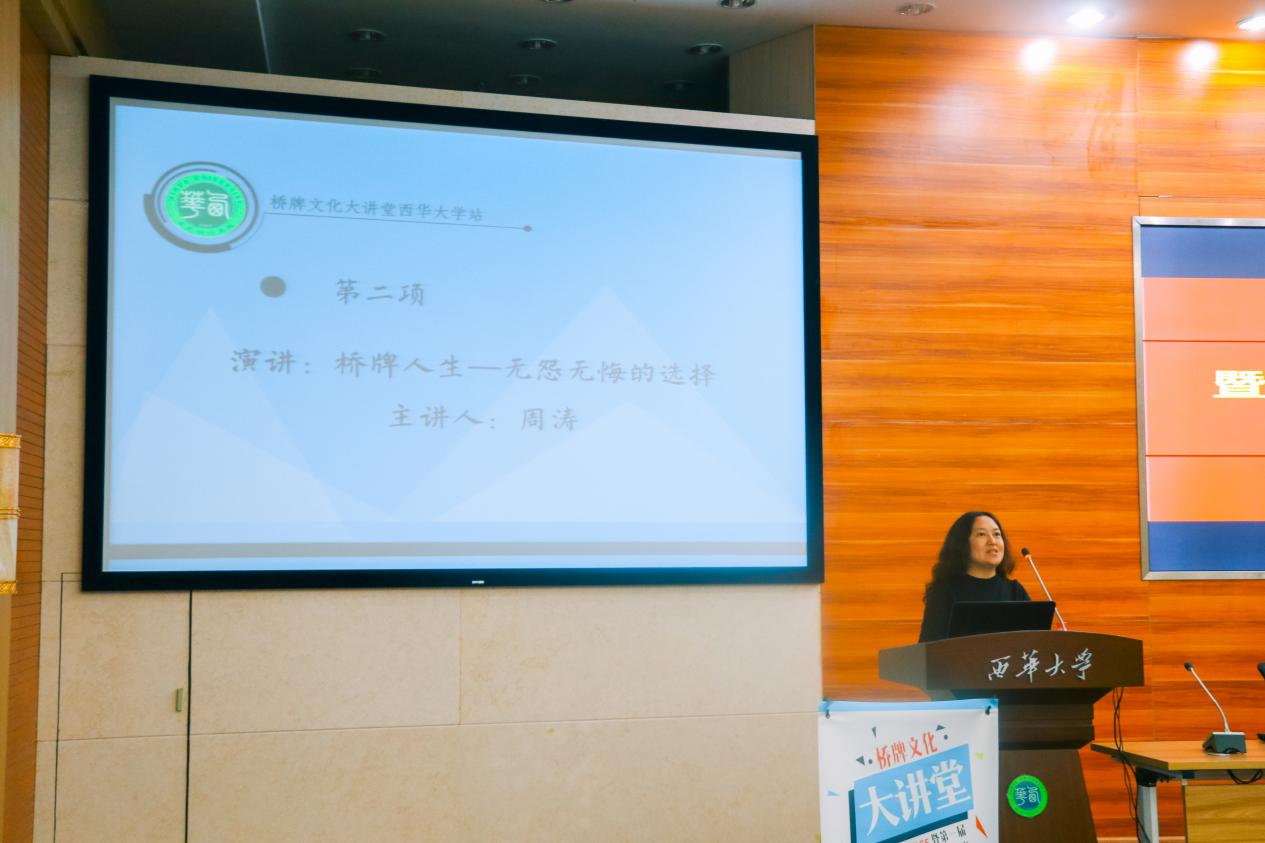 讲堂一开始,桥牌世界冠军周涛发表了一段真情流露、平和朴实的演讲《桥牌人生——无怨无悔的选择》。周涛女士以个人学习历程为切入点,分享了她循序渐进的学习历程及切身体会到的桥牌的益处。她30岁开始接触桥牌,作为一个半路出家的门外汉,依靠对桥牌的热爱一路摸索前进,不断积累经验、技巧,结识了许多良师益友。谈及桥牌的益处,她总结出“提升团队意识”、“使人更加包容”、“使人心态平和乐观”、“使人反省总结从而快速成长”这四点心得与观众共勉。随后,周涛女士为帮助桥牌爱好者提升技术提出了几点建设性意见,如日常勤练简单数字的加减法、赛中始终保持注意力集中、团结团队成员。在展望桥牌文化的迅速普及的同时,周涛女士也表达了对大学生学习桥牌、参与桥牌比赛的美好期待。她的演讲不仅增长了在座桥牌初学者对桥牌的认识,也有效引导了初学者掌握学习要领。