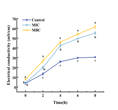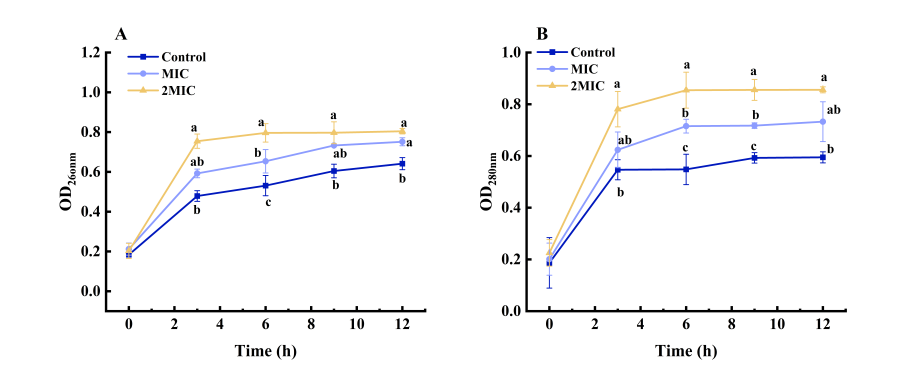 研究分析AEO对P.fluorescens的抗菌活性发现,AEO对P. fluorescens 的MIC为12.5 μl/mL,MBC为25 μl/mL,SEM观察到荧光假单胞菌在2MIC的AEO处理后细胞形态受损严重,菌体大量死亡,显著抑制了细胞生长速率。此外,AEO处理导致AKP酶活性和电导率增加,细胞内核酸和蛋白等大分子合成物质明显泄露,证明细胞壁和细胞膜的完整性被破坏。