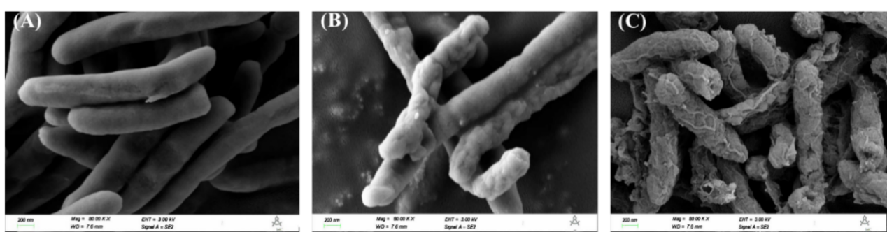 图 2 P. fluorescens的扫描电镜:(A)对照组;(B)MIC 组;(C)2MIC 组