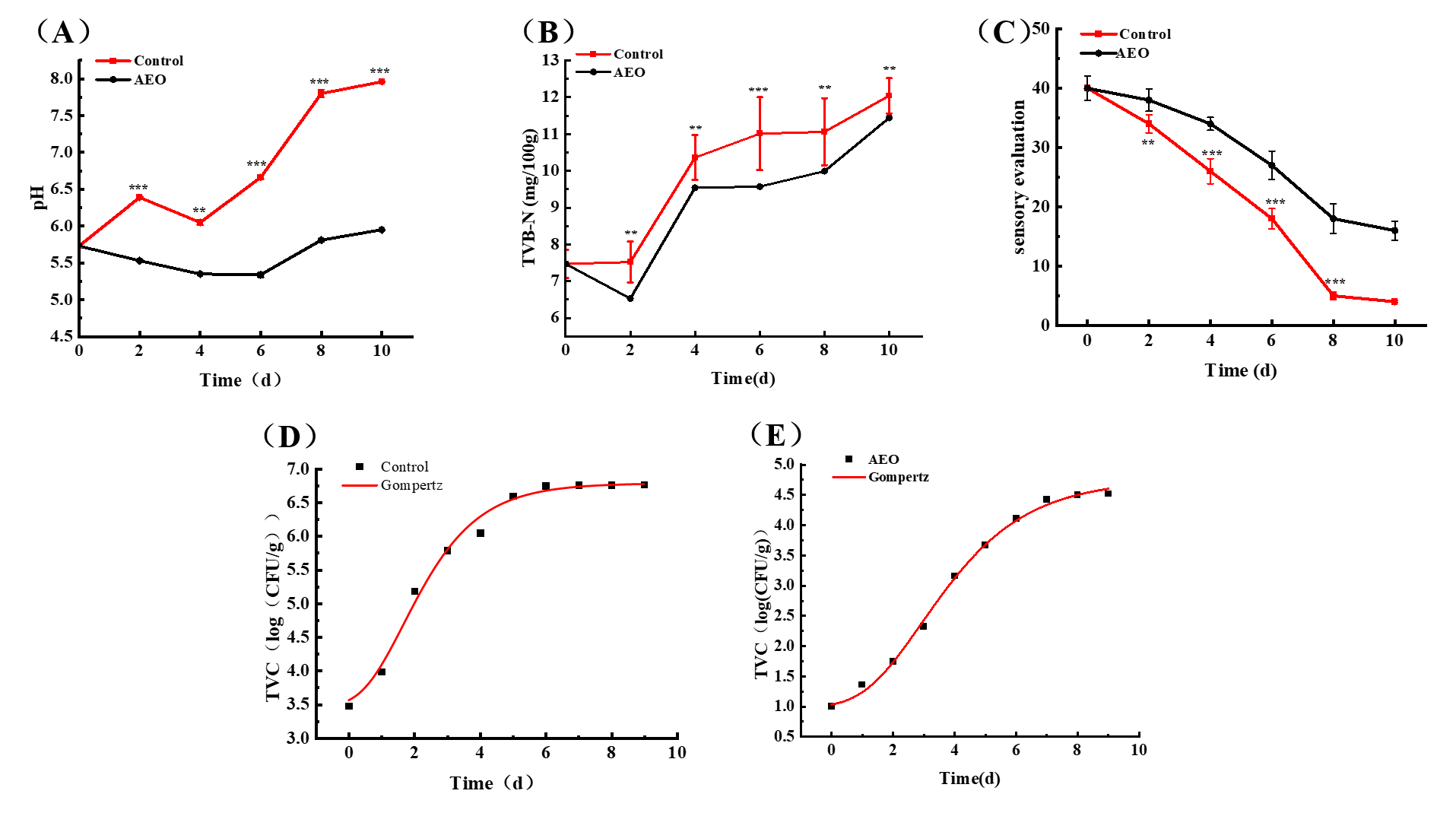 图5 AEO 复合膜对(A)冷藏牛肉 pH 值、(B)TVB-N 和(C)感官评分的影响;(D)和(E)菌落总数的 Gompertz 模型