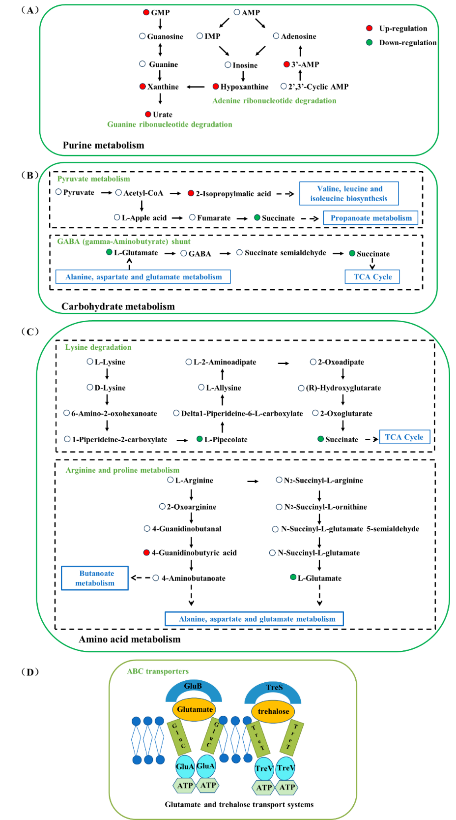图 4(A)嘌呤代谢相关途径、(B)碳水化合物代谢相关途径和(C)氨基酸代谢相关途径;(D)膜转运