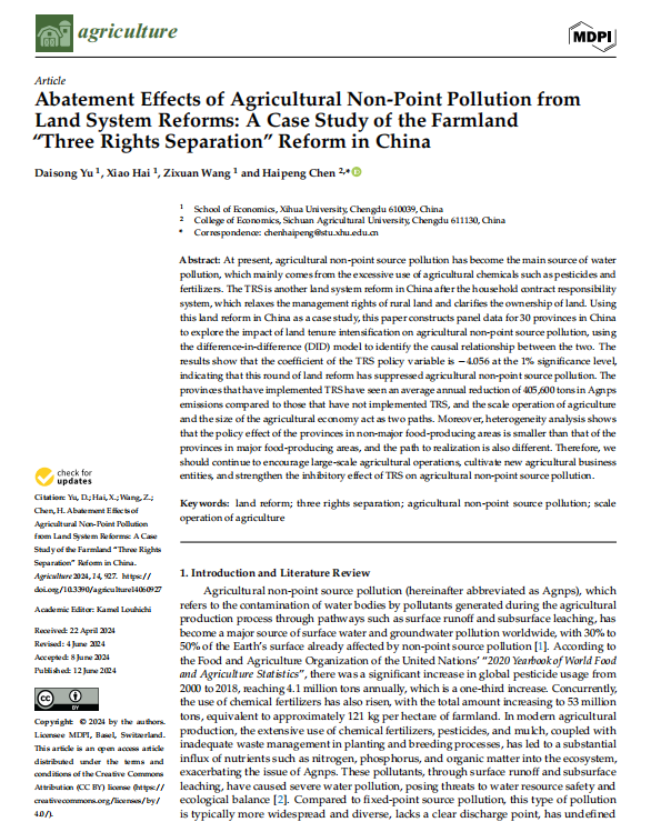 近日,经济学院于代松教授研究团队在SCI期刊《Agriculture》(JCR一区,ISSN:2077-0472,近三年影响因子为3.6)发表题为Abatement Effects of Agricultural Non-Point Pollution from Land System Reforms: A Case Study of the Farmland ‘Three Rights Separation’Reform in China”的研究论文。于代松教授为论文的第一作者,2022级硕士研究生海啸为第二作者,西华大学为论文的第一完成单位。
