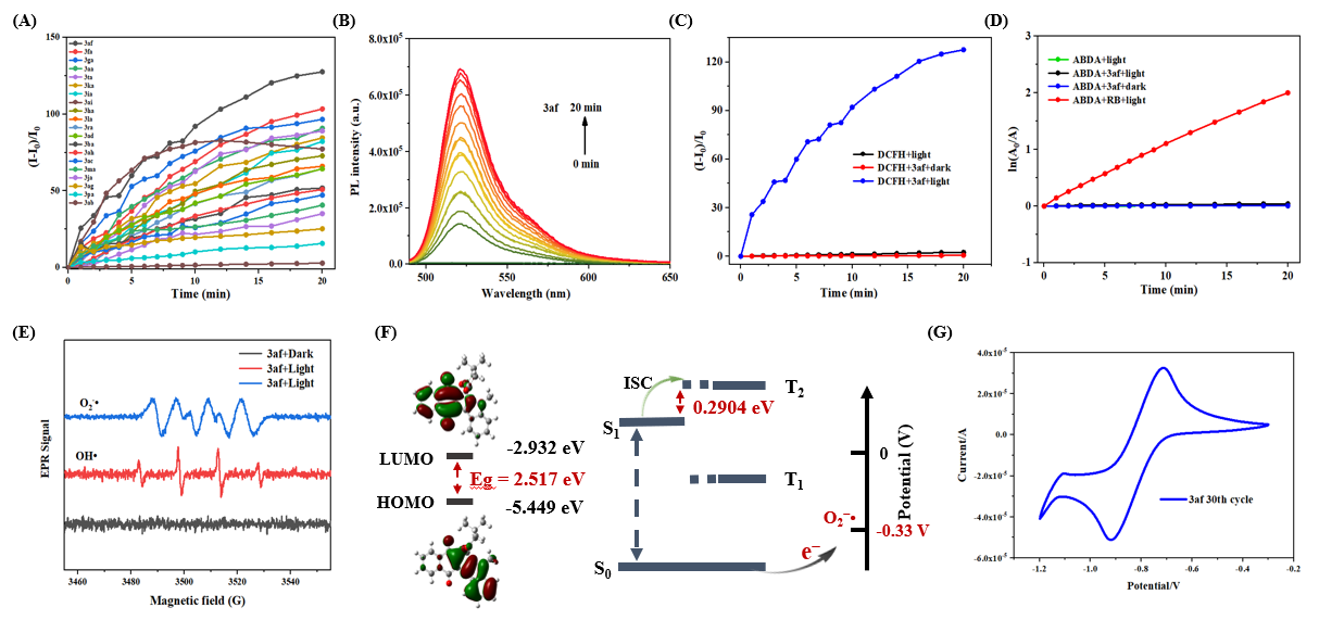 随后,作者对化合物的光物理性质进行了研究,优异的光物理性质使其具有成为PS的可能,通过对其中20种化合物的总活性氧检测,作者挑选了效果最好的3af化合物进行后续研究,实验数据及理论计算等证明3af化合物是一种基于稠环醌结构的纯I型PS。(图4)