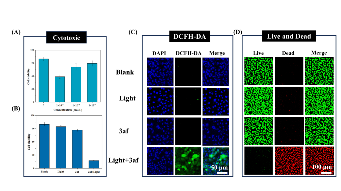 最后,进行了细胞毒性、细胞内活性氧以及活死细胞实验,所有这些数据证实,3af在细胞水平上表现出良好的ROS生成能力和PDT效应。(图5)