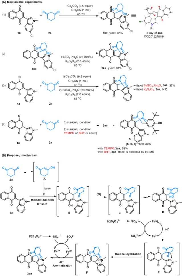 为了探究其反应机理,作者进行了多组对照实验,结果表明该反应经历吲哚萘醌和1,3-二羰基化合物的Michael加成/铁(II)催化的自由基环化/芳构化过程。(图3)