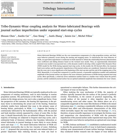 近日,机械工程学院张均富教授研究团队在SCI期刊《Tribology International》(JCR一区,ISSN:0301-679X,近三年影响因子为6.1)发表题为Tribo-Dynamic-Wear coupling analysis for Water-lubricated Bearings with journal surface imperfection under repeated start-stop cycles的研究论文。团队陈守安博士为论文的第一作者,法国普瓦捷大学Michel Fillon教授为共同作者,西华大学为论文的第一完成单位。