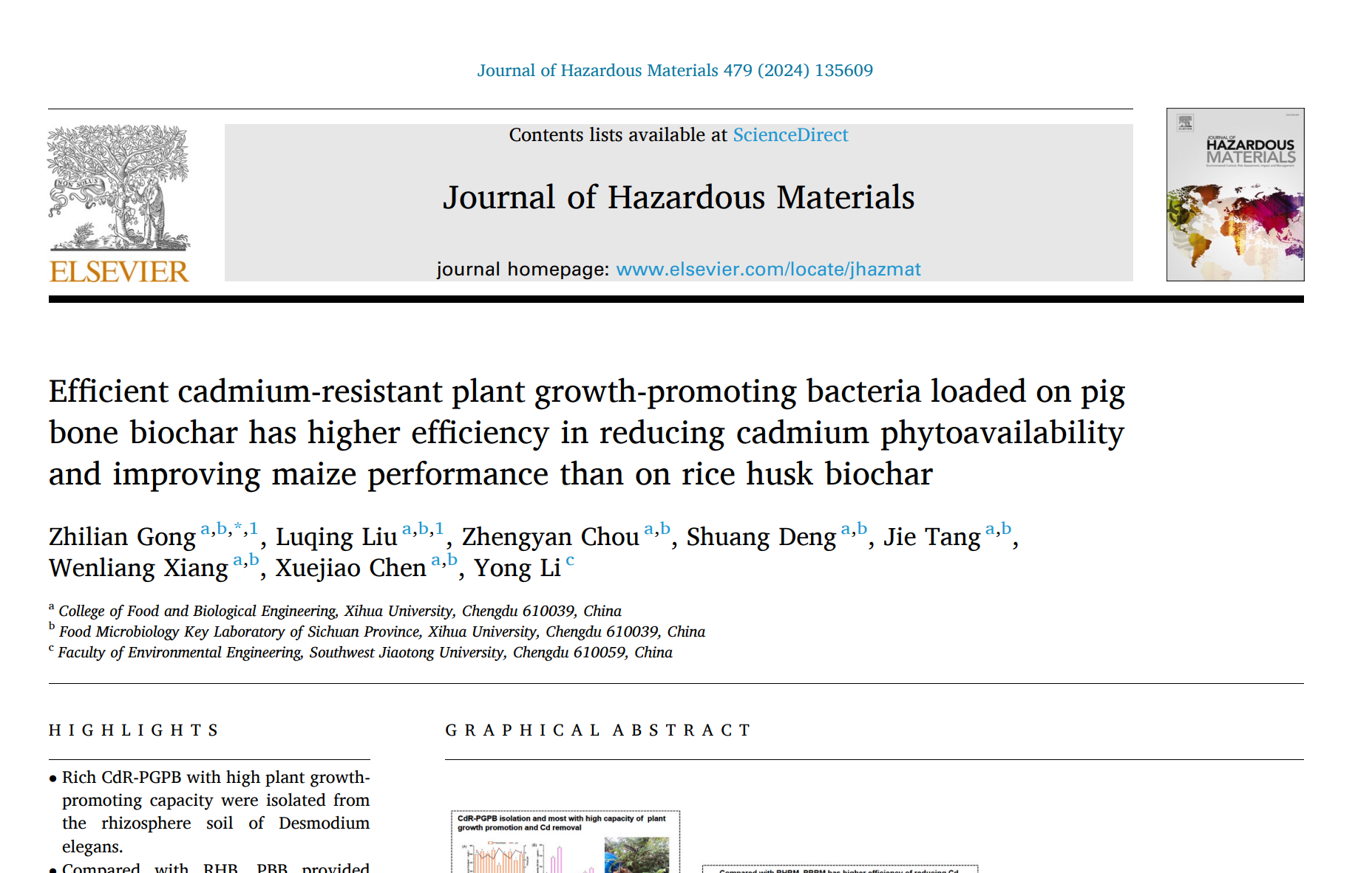 近日,我校食品与生物工程学院食品科学团队教师龚志莲在国际Top一区学术期刊《Journal of Hazardous materials》 (Q1, IF: 12.2)发表题为“Efficient cadmium-resistant plant growth-promoting bacteria loaded on pig bone biochar has higher efficiency in reducing cadmium phytoavailability and improving maize performance than on rice husk biochar”的研究论文。龚志莲教师为该论文的第一作者及通讯作者, 2021级硕士研究生刘路情为该论文的共同第一作者,西华大学为第一通讯单位,唐洁教授等团队老师为本研究工作提供了重要指导和帮助。