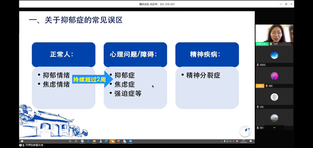 讲座伊始,刘婷由近期社会热点新闻引入大众对抑郁症的普遍认识,讲解关于抑郁症的常见误区,并向听众发问:“你认为抑郁症、焦虑症和精神分裂症有什么不同?”老师们也以开麦或留言的方式进行了积极回应。接着,刘婷具体从“抑郁症如何产生”“抑郁症的表现有哪些”“如何预防抑郁及治疗对策”几个方面进行了讲授,结合临床和现实事例,用通俗易懂的语言将专业的概念和解释传递给参与者。在提问环节,很多老师积极提问,关注包括如何寻医问诊、如何缓解老年人的抑郁情绪等问题,刘婷都一一作出了专业解答。