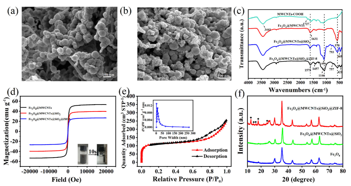 通过扫描电镜显微镜、N2吸附-脱附分析、傅里叶红外光谱仪、振动样品磁强计等表征技术表明,该吸附剂具有超顺磁性,能轻松的从溶液中分离。优异的比表面积和较大的孔容能够为目标分析物的吸附提供更多的活性位点。