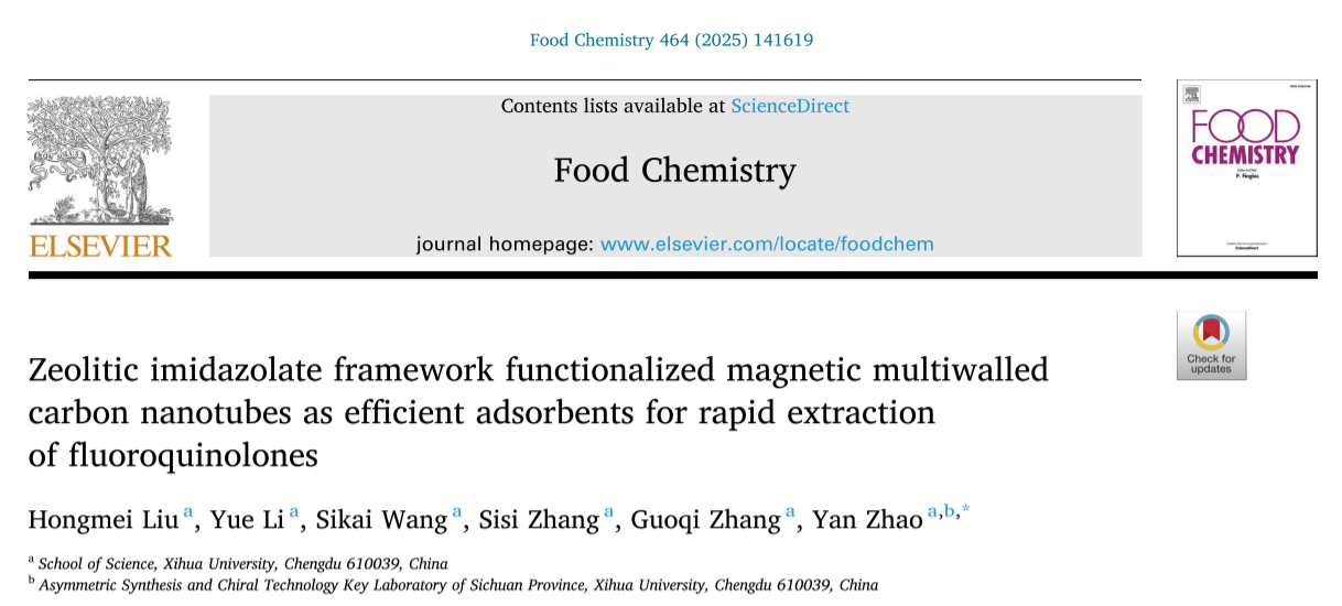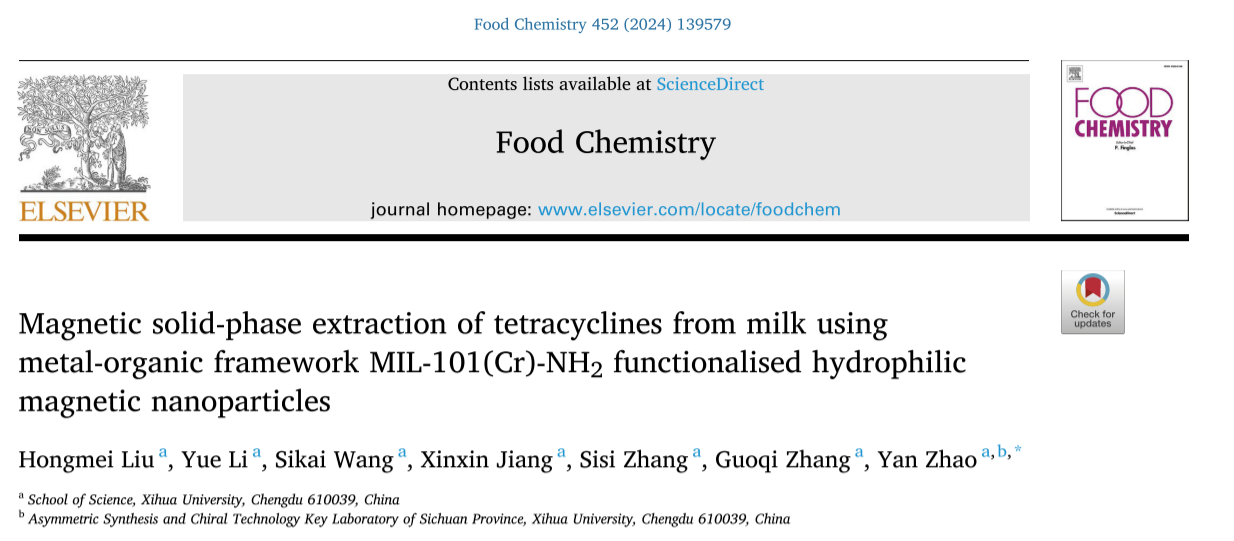 近日,理学院赵艳教授课题组在食品领域TOP期刊Food Chemistry (中科院1区,IF:8.5) 期刊连续发表题为“Magnetic solid-phase extraction of tetracyclines from milk using metal-organic framework MIL-101(Cr)-NH2 functionalised hydrophilic magnetic nanoparticles”和“Zeolitic imidazolate framework functionalized magnetic multiwalled carbon nanotubes as efficient adsorbents for rapid extraction of fluoroquinolones”的研究性论文。第一作者为理学院2022级研究生刘红梅,通讯作者为赵艳教授,西华大学为论文的第一完成单位。