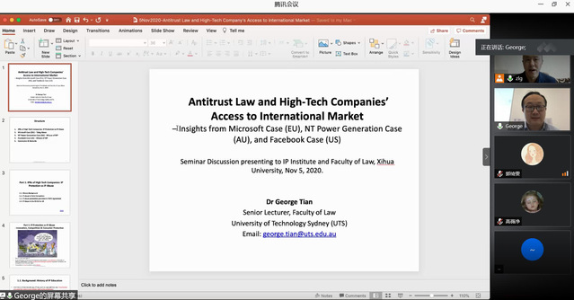 11月5日上午,澳大利亚悉尼科技大学法学院高级讲师、西华大学知识产权学院、法学院特聘教授田一钧博士通过线上会议的方式为西华大学知识产权学院、法学院的师生作了 “反垄断法与高科技企业国际市场准入”的专题讲座。西华大学知识产权学院、法学院的80余名师生参加了此次讲座。