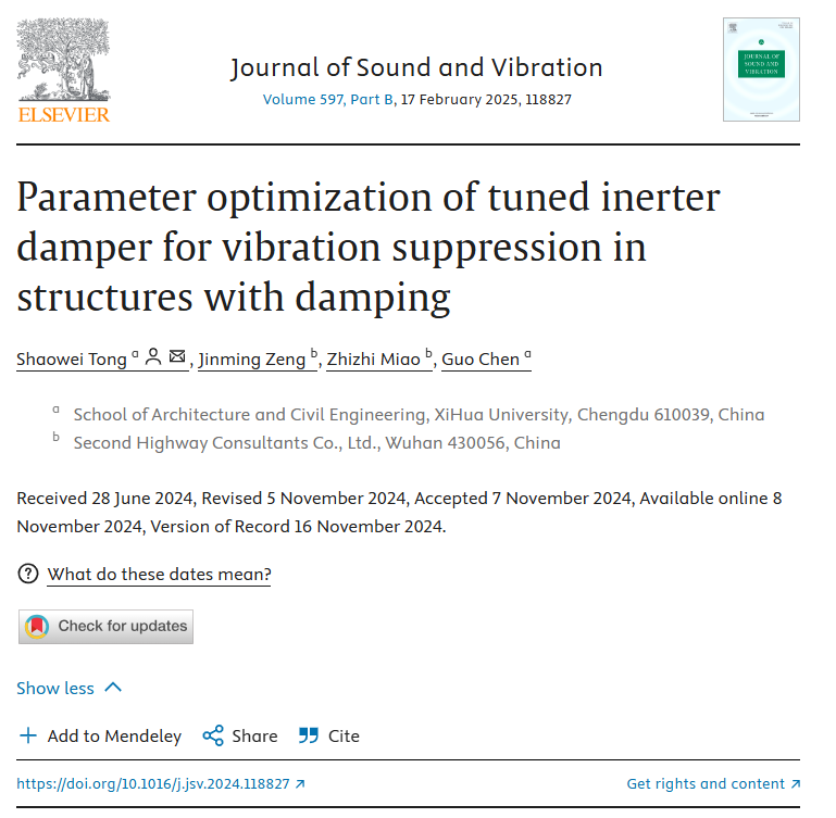近日,建筑与土木工程学院力学教学部童少伟老师在声音与振动领域国际顶级期刊Journal of Sound and Vibration(JCR1区,中科院2区)发表题为“Parameter Optimization of Tuned Inerter Damper for Vibration Suppression in Structures with Damping”的研究论文。论文以西华大学为第一单位和通讯单位,童少伟老师为论文的第一作者和通讯作者。