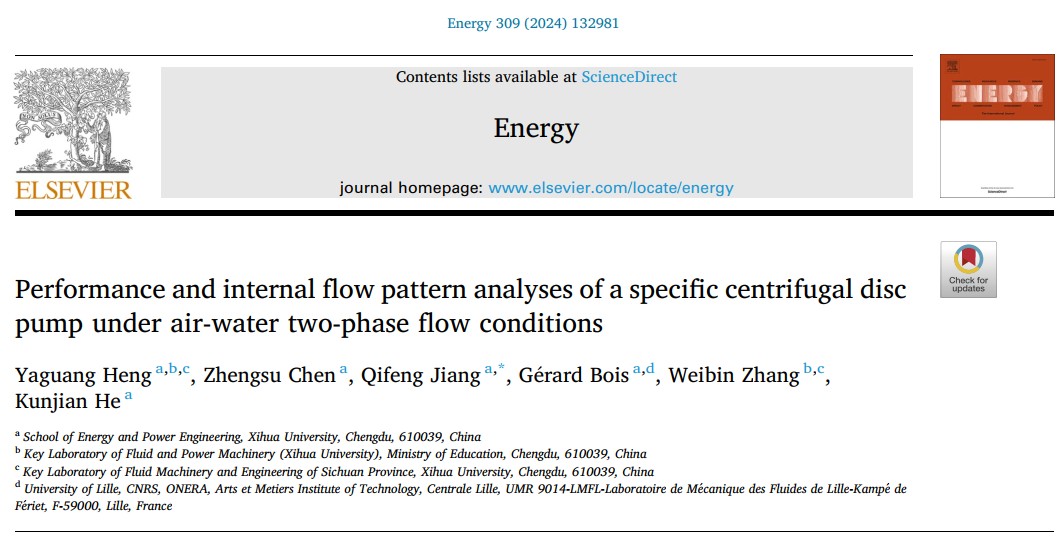 我校能源与动力工程学院衡亚光副教授与航空航天学院江启峰教授组成的复杂流体力学研究团队在国际能源一区TOP期刊《ENERGY》(IF:9)发表重要成果,题目为“Performance and internal flow pattern analyses of a specific centrifugal disc pump under air-water two-phase flow conditions”。