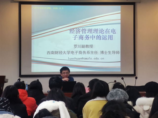 12月3日上午,经济学院特邀西南财经大学电子商务系主任兼博士生导师罗川副教授在1A4036开展题为“经济管理理论在电子商务中的运用”的主题讲座。经济学院电子商务专业部分学生代表参加了此次讲座。