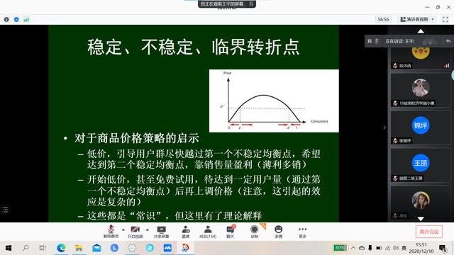 讲座中,王宇通过引入“2015年春晚摇一摇互动出现峰值”这一案例,表明网络经济目前已受到了人们的高度重视。同时,他从网络经济的发展背景进行阐述,指出人们的日常生活已与网络经济高度融合,数据成为网络经济市场最重要的竞争因素。随后,他通过剖析“打败台湾康师傅公司的是外卖”,“打败捷安特的是共享单车”等现实生活中的案例,着重强调了网络经济对于产业结构的影响之大,跨界经济发展中优胜劣汰的现象仍突出,由此引发同学们对网络经济驱动社会变革的思考。讲座结束之际,王宇通过语音与同学们进行线上互动答疑,帮助同学们进一步了解网络经济的相关知识。