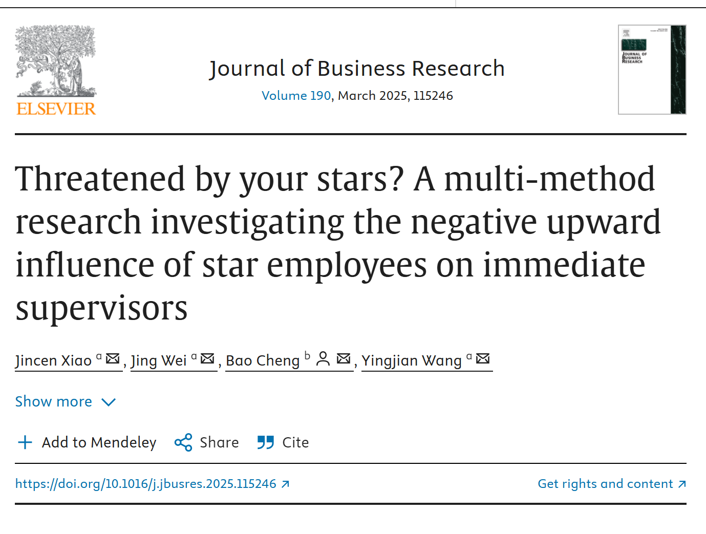受教育部人文社科青年基金资助,肖金岑副教授课题组已发表2篇SSCI一区和1篇CSSCI论文。作为基金项目的又一成果,该研究探讨了企业管理中的明星员工相关管理问题,在压力评估理论的基础上,通过多方法设计(情景实验+多源时滞调查),发现明星员工是管理者的一种工作压力源,当管理的被信任感偏低时,会触发管理者的地位威胁知以及相应的自我保护行为。这一发现打破了传统的沿着组织层级“从上往下”(管理者→员工)的固有认知,为理解组织管理中管理者和员工的复杂动态影响提供了新视角。