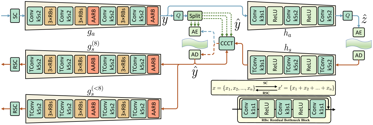 GLIC模型框架通过Reconstruction Split and Concat(SC/RSC)模块,将任意通道数图像转换为二维矩阵处理,解码时还原原始格式。模型核心由分析器、合成器以及超先验分析器和超先验合成器构成,用于优化编码效率。CCCT模块通过均匀分组潜在表示、优先处理信息量较大块,解决多通道图像信息冗余问题,加速编解码并保证预览图像质量。AARB模块融合注意力机制与残差网络优势,自适应识别语义信息重要性,提升压缩效率的同时保证图像高保真度。