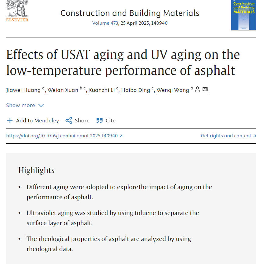 近日,由建筑与土木工程学院王文奇副教授指导的2023级土木工程硕士研究生黄嘉伟以第一作者身份,在建筑与建材领域国际TOP期刊《Construction and Building Materials》(一区Top,IF=7.4)发表题为“Effects of USAT aging and UV aging on the low-temperature performance of asphalt”的研究论文。王文奇副教授为通讯作者,论文以西华大学为第一单位和通讯单位。