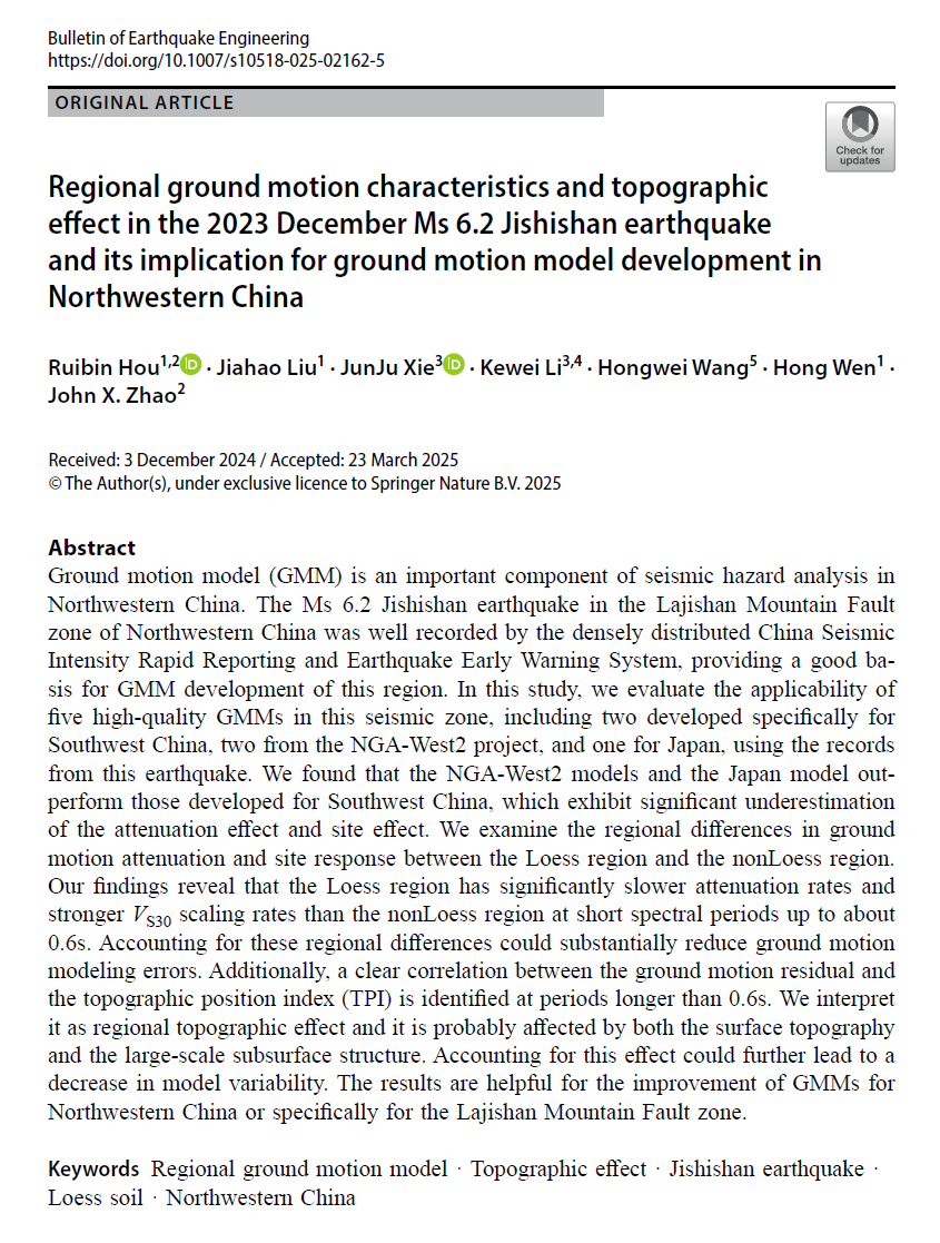 近日,建筑与土木工程学院道路与桥梁工程系青年教师侯瑞彬在欧洲地震工程协会官方出版期刊《Bulletin of Earthquake Engineering》(中科院二区,IF=4.1)发表学术论文。论文题目为“Regional ground motion characteristics and topographic effect in the 2023 December Ms 6.2 Jishishan earthquake and its implication for ground motion model development in Northwestern China”,西华大学为第一单位,侯瑞彬老师为第一作者,我校2022级本科生刘家豪为第二作者,中国地震局地球物理研究所谢俊举研究员为通讯作者。