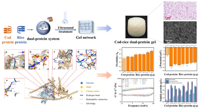 将植物蛋白与动物蛋白混合以获得足够的膳食蛋白质摄入量是解决老年人饮食不足的一种策略。本研究系统地研究了鳕鱼蛋白/大米蛋白的比例(21:0、21:1.5、21:3、21:4.5、21:6、21:7.5和21:9)对双蛋白凝胶性能的影响及其相互作用机制。结果表明,与单一鳕鱼凝胶相比,鳕鱼蛋白/米蛋白在21:6时,双蛋白凝胶的硬度和弹性分别提高了73.96%和17.28%。结合光谱和分子对接的结果,双蛋白主要通过氢键和疏水相互作用相互作用。本研究从分子水平为双蛋白相互作用影响凝胶性质的机理提供了理论依据。
