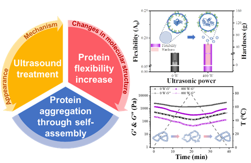 全球人口正在经历老龄化,老年人经常因咀嚼和吞咽困难而难以摄入凝胶类制品。本研究通过超声改性预热鳕鱼蛋白分子柔性,促进柔性分子自组装聚集形成网络结构,开发软质蛋白凝胶类制品。研究发现超声处理显著降低蛋白质颗粒尺寸,提高表面疏水性,促使分子柔性增加;柔性蛋白分子在冷却过程中通过自组装聚集,形成了适宜老年人等咀嚼/吞咽障碍人群食用的鳕鱼蛋白凝胶。