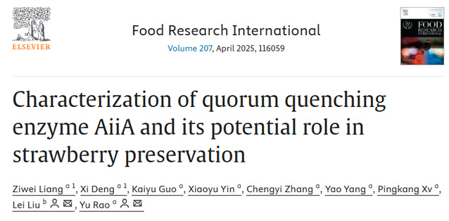 近日,食品与生物工程学院饶瑜教授团队在国际食品Top期刊《Food Research International》(Q1,IF: 7.0)发表题为“Characterization of quorum quenching enzyme AiiA and its potential role in strawberry preservation”的研究性论文。西华大学教师梁紫微和硕士生邓西为共同第一作者,通讯作者为饶瑜教授和兰州大学动物医学与生物安全学院青年研究员刘蕾。