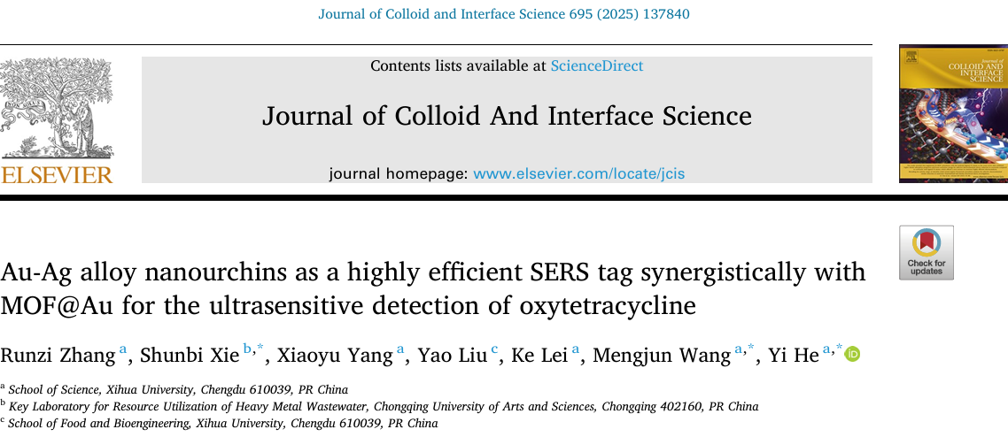 近日,理学院何毅博士在化学Top期刊《Journal of Colloid And Interface Science》(中科院一区,IF: 9.4)发表题为“Au-Ag alloy nanourchins as a highly efficient SERS tag synergistically with MOF@Au for the ultrasensitive detection of oxytetracycline”的研究论文。西华大学2023级研究生张润滋为第一作者,何毅博士为该论文的通讯作者,西华大学为第一通讯单位。