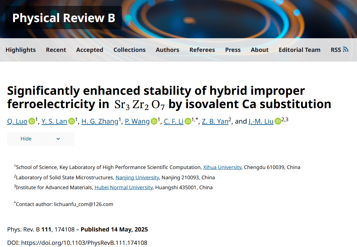 近日,理学院青年教师李川福在国际物理学领域权威期刊《Physical Review B》发表题为“Significantly enhanced stability of hybrid improper ferroelectricity in SrZr2O7 by isovalent Ca substitution”的学术论文。西华大学为该论文的第一完成单位,理学院李川福博士为该论文的通讯作者,2022级硕士生罗倩为论文第一作者。