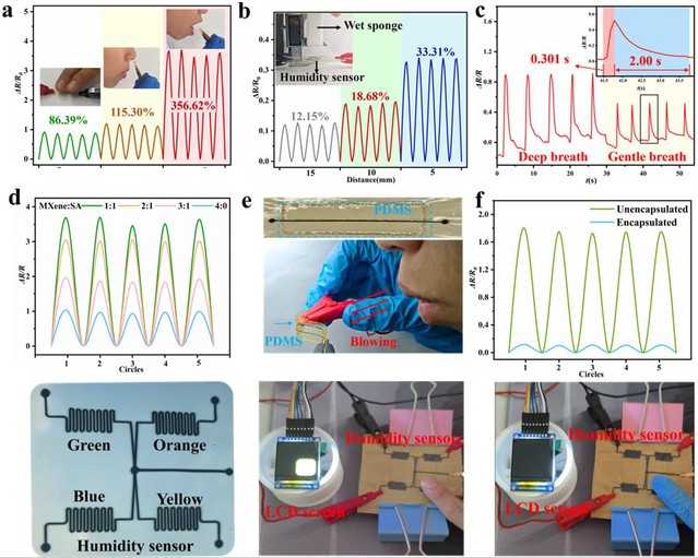 最终制备的MXene/SA@CS柔性传感器展现出卓越的综合性能:其温度灵敏度系数(TCR)达1.08% ℃⁻¹,较传统MXene墨水基传感器提升103%;在人体呼气检测中实现357%的电阻响应幅值,伴随0.30秒极速响应时间和2.00秒恢复时间。尤为重要的是,基于CS基底的MXene/SA复合结构不仅表现出优异的生物相容性,更通过原位抗菌特性为可穿戴健康监测设备构筑了生物安全屏障。作为技术验证,研究团队开发了非接触式湿度调控系统,成功实现LCD显示器的智能调制,充分展现了该传感器在人机交互领域的革新应用潜力。这项工作开创性地融合了气溶胶喷射打印技术与界面工程策略,为构建高性能、长寿命的柔性MXene基传感器提供了全新范式,对先进可穿戴电子设备的研发具有重要指导价值。
