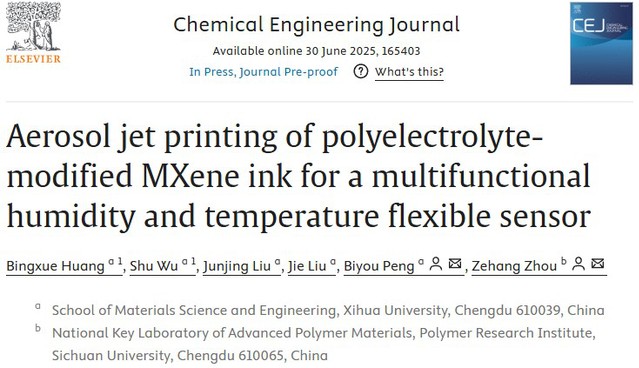 近日,材料科学与工程学院彭必友教授团队在材料科学与工程领域顶级期刊《Chemical Engineering Journal》(IF=13.2)发表题为“Aerosol jet printing of polyelectrolyte-modified MXene ink for a multifunctional humidity and temperature flexible sensor”的研究论文。彭必友教授与四川大学周泽航副研究员担任本论文的共同通讯作者,西华大学材料科学与工程学院青年教师黄冰雪博士及2023级硕士研究生吴戍为该论文的共同一作,西华大学为第一完成单位,四川大学为第二完成单位。该项研究得到了北京化工大学有机-无机复合材料国家重点实验室开放基金、广西碳酸钙资源综合利用重点实验室开放项目的资助。