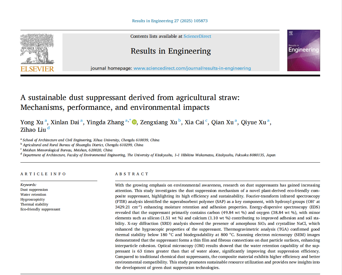 近日,建筑与土木工程学院建筑工程系教师徐咏作为第一作者在国际知名期刊《Results in Engineering》发表题为“A sustainable dust suppressant derived from agricultural straw: Mechanisms, performance, and environmental impacts”的研究论文,建筑与土木工程学院张英达副教授为通讯作者,建筑与土木工程学院2022级本科生戴欣兰为第二作者,西华大学为第一单位。
