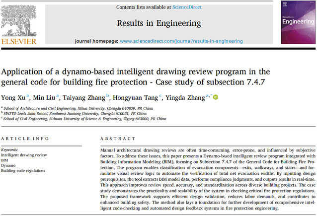 近日,建筑与土木工程学院徐咏博士团队在国际知名期刊《Results in Engineering》(影响因子7.9,位于工程领域前3%,中科院分区2区)发表题为“Application of a dynamo-based intelligent drawing review program in the general code for building fire protection - Case study of subsection 7.4.7”的研究论文。建筑与土木工程学院张英达副教授为通讯作者,徐咏博士及2023级硕士研究生刘敏为该论文的共同第一作者,西华大学为第一完成单位。