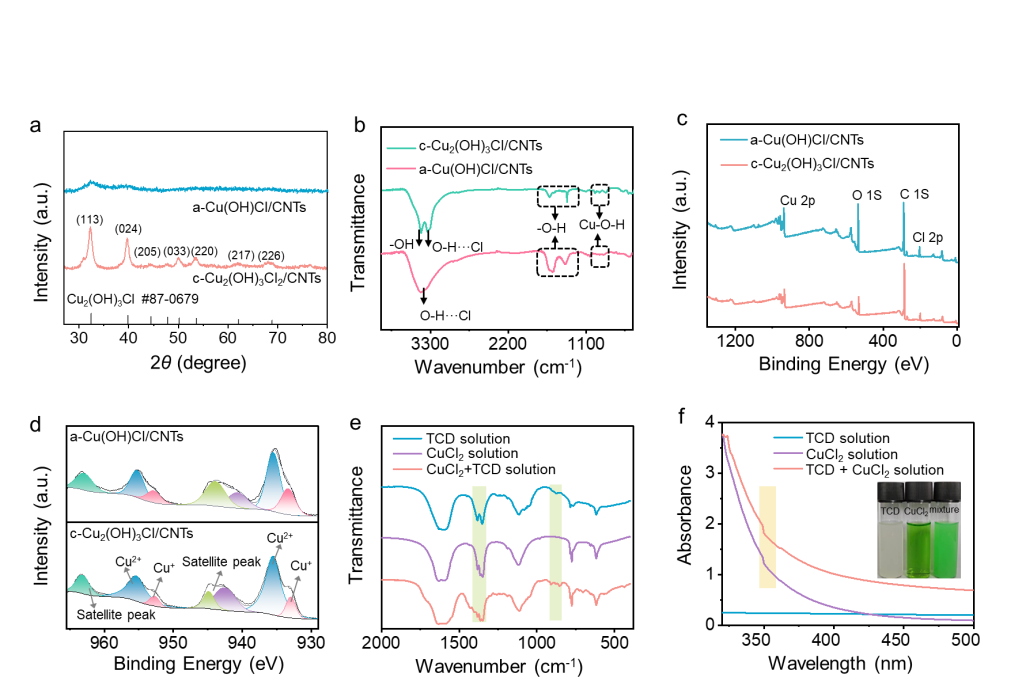 a-Cu(OH)Cl/CNTs和c-Cu2(OH)3Cl/CNTs样品的XRD、XPS和红外谱图分析