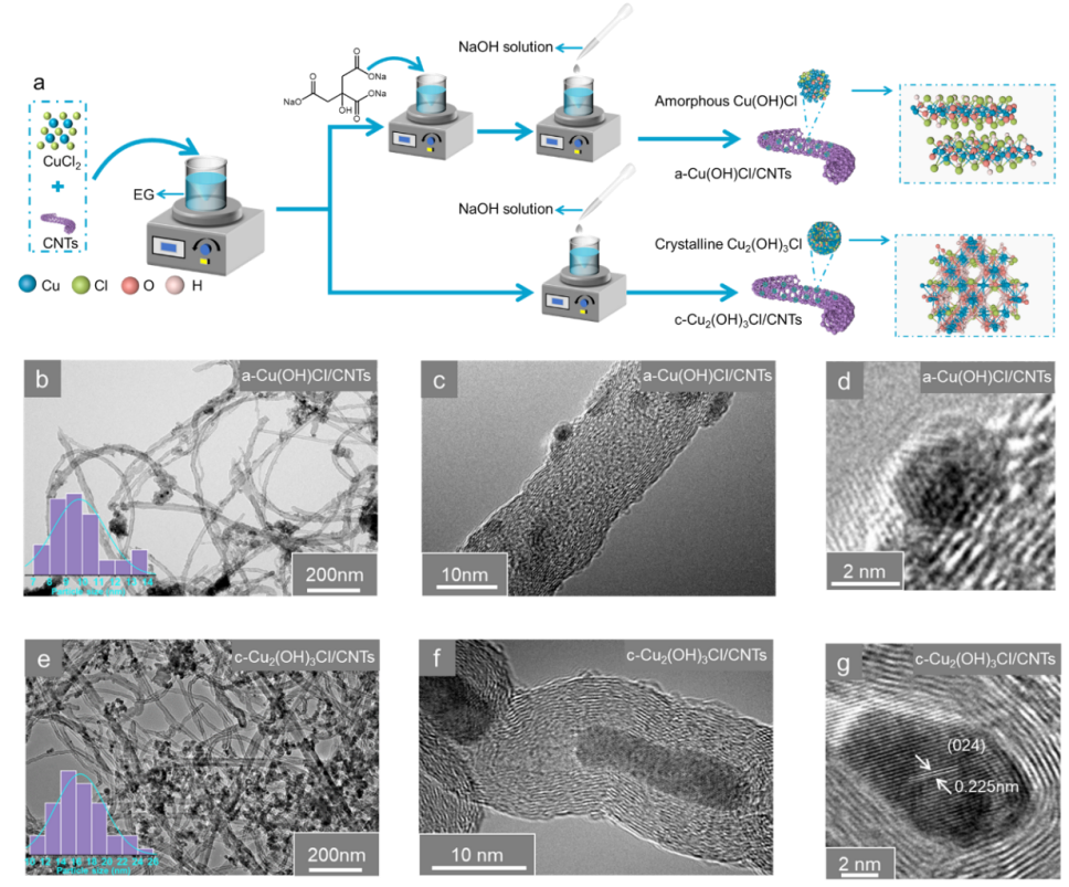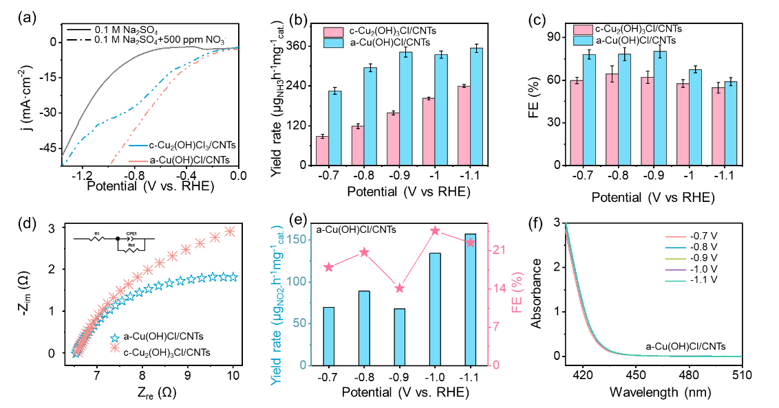 电催化硝酸盐还原反应(NITRR)合成氨是实现硝酸盐水体污染去除和氮循环利用的一种有效途径。目前,电化学NITRR领域的挑战在于设计和开发稳定高效的电催化剂。本文在室温下通过一种简单的螯合共沉淀法在碳纳米管上均匀生长直径约为9 nm的无定形Cu(OH)Cl纳米团簇(a-Cu(OH)Cl/CNTs)用于高选择性电催化NITRR合成氨。值得注意的是,柠檬酸三钠(TCD)可以有效地改变铜纳米团簇的晶体形式,得到a-Cu(OH)Cl纳米团簇,而不是高结晶度的Cu2(OH)3Cl (c-Cu2(OH)3Cl)纳米团簇。与c-Cu2(OH)3Cl纳米团簇相比,a-Cu(OH)Cl纳米团簇具有更小的粒径和更多的表面低配位Cu原子,在电催化NITRR过程中能提供更丰富的有效催化活性位点,从而提高了电催化NITRR合成NH3的选择性和能量效率。本文为后续通过金属纳米团簇的晶体调制策略提高电催化NITRR性能,提供了一定的实验和理论参考。